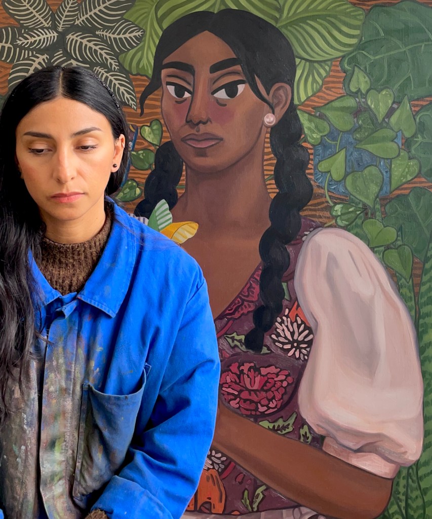 Rocio Navarro (Chihuahua, México 1991) is an artist based in France. Through vivid coloured portraits she unravels experiences lived between two nations. Plants and everyday objets accompany her subjects, which she portrays in determined quiet action surrounded by blocks of colours. Often with humour her work explores highlights in the mundane.